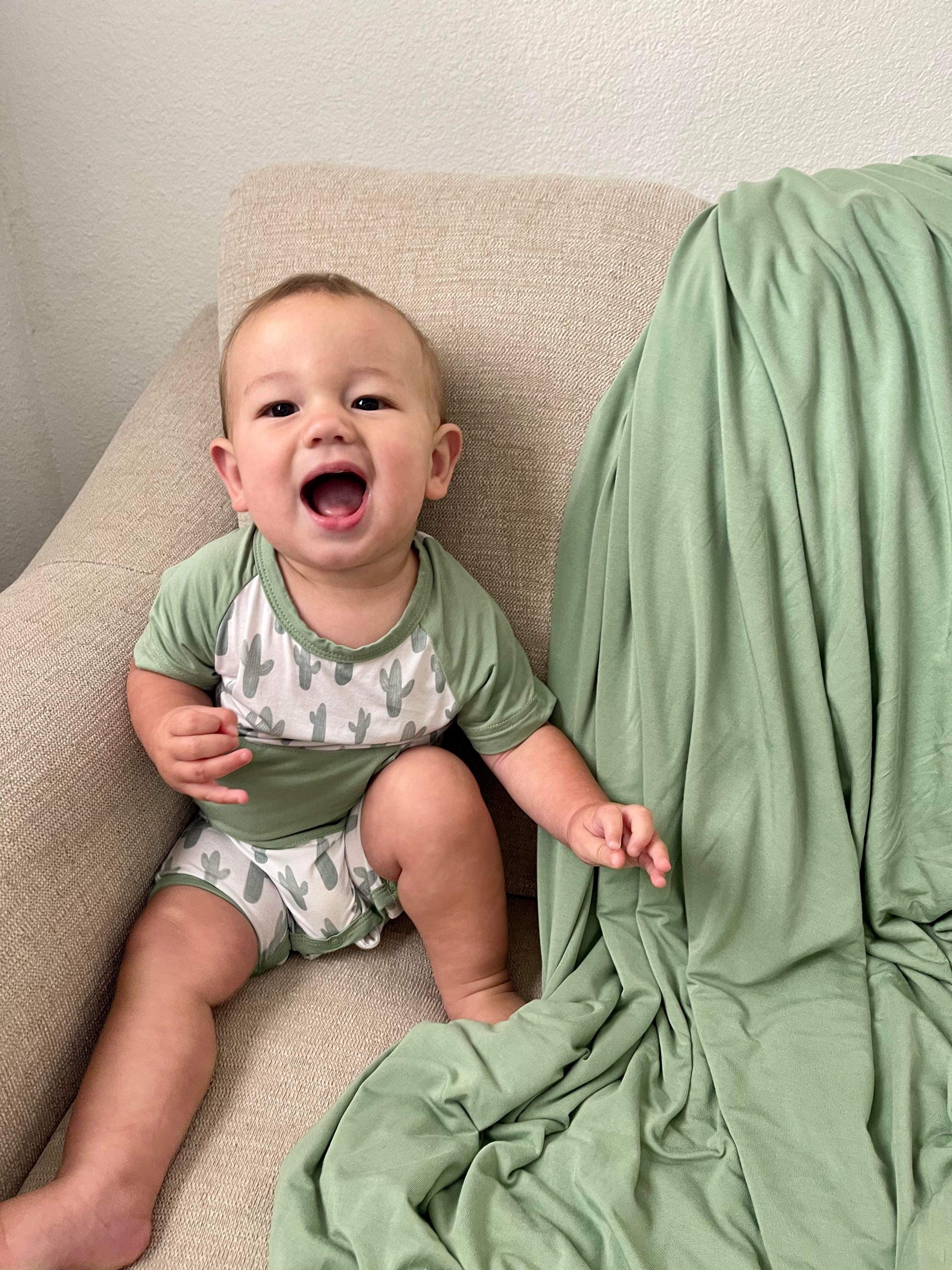 Our shortie is made with 95% bamboo viscose and 5% spandex. The bamboo is more breathable than cotton and will keep your little one cooler in the warmer months and is great for sensitive skin.